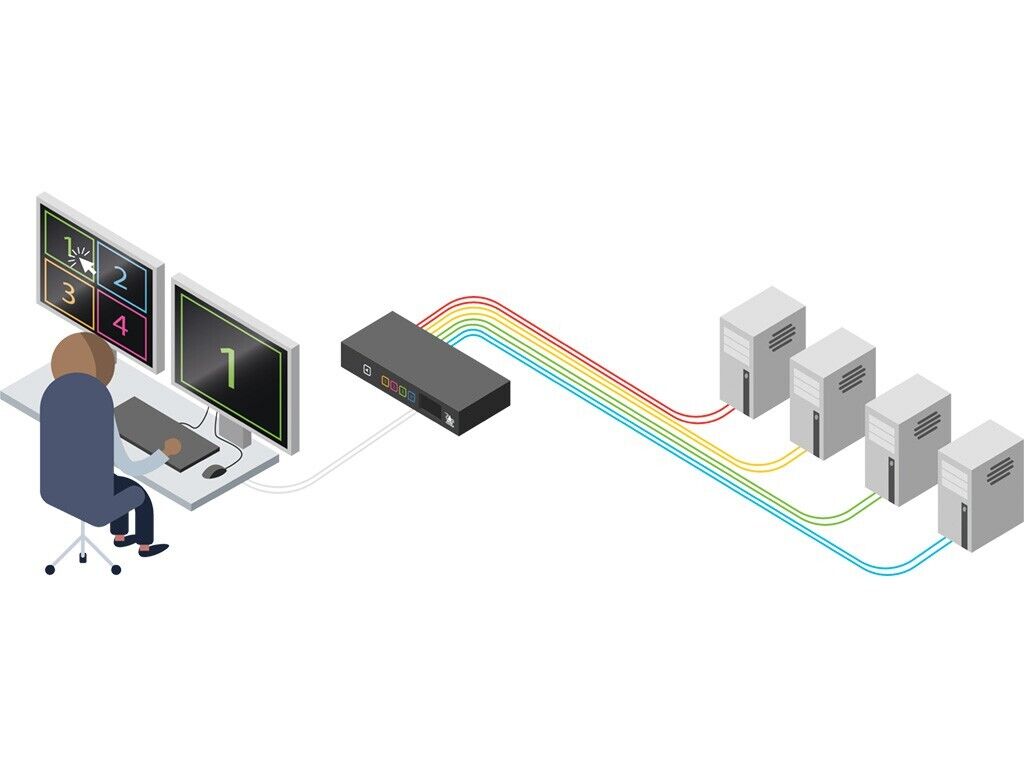 Er ermöglicht Benutzern vollständige Systemkontrolle und optimiert Arbeitsplätze mit pixelgenauer Visualisierung von bis zu vier Videosignalen auf einem oder zwei Monitoren. Die individuell anpassbaren, farbkodierten Fensterumrandungen ermöglichen es dem Benutzer, schnell zu entscheiden, welche Daten wie dargestellt werden sollen. Bewegen Sie einfach den Mauszeiger zwischen den Fenstern, um in Echtzeit und ohne Latenz zwischen den Quellcomputern umzuschalten.