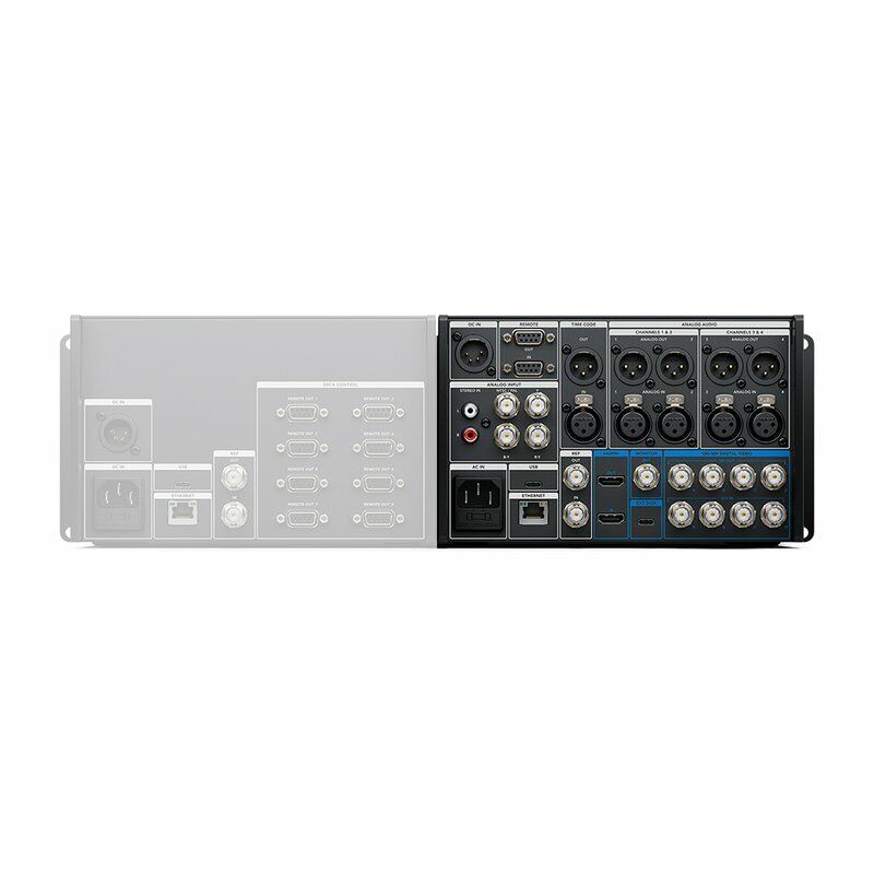 - Analogaudio-Eingänge: 4 Kanäle für professionelles symmetrisches Analogaudio über XLR-Anschlüsse und 2 Kanäle für unsymmetrisches Consumer-Audio über RCA-Anschlüsse
