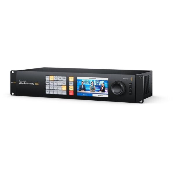 Die Blackmagic Videohub 40×40 12G ist eine fortschrittliche latenzfreie Kreuzschiene für beliebig kombinierte SD-, HD- und Ultra-HD-Videosignale, simultan auf derselben Kreuzschiene. Sie verfügt über vierzig 12G-SDI-Eingänge, vierzig 12G-SDI-Ausgänge, redundante Stromversorgung plus Referenzanschlüsse in einem Design aus zwei Rack-Einheiten. Auf dem Frontblenden-LCD sichten Sie Video vor dem Routing. Auch kann man dort Routing-Labels und Videonormen deutlich ablesen. Die Signalverteilung lässt sich direkt per Tastendruck oder mithilfe des großen Drehreglers vorgeben, der mit einer elektronischen Kupplung ausgestattet ist. Neben SDI-Reclocking und externer Steuerung per Ethernet werden alle SDI-Videonormen bis 2160p/60 unterstützt.