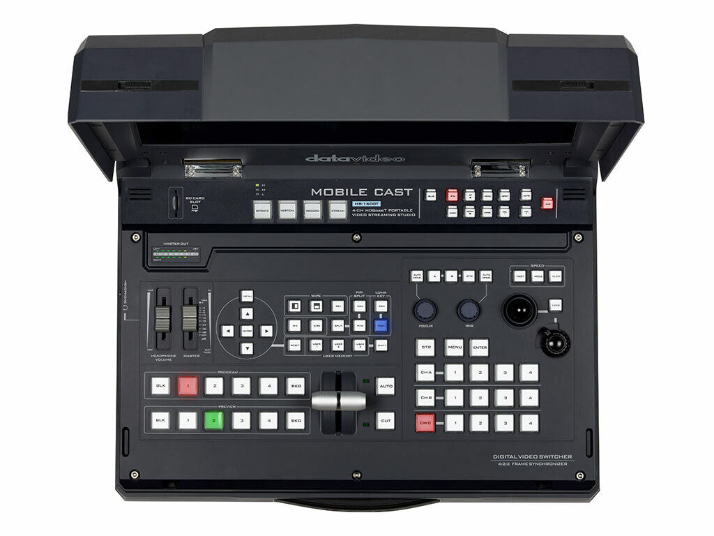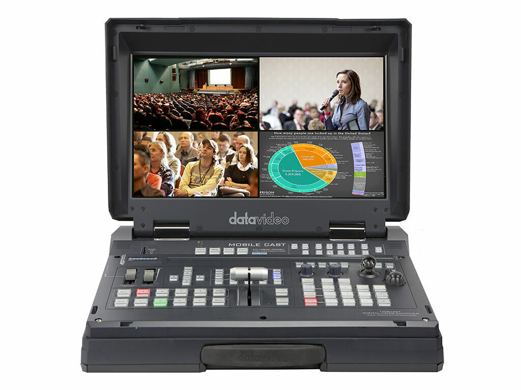 Tragbare Produktionseinheit, die als Kofferausstattung konzipiert ist; Video-Umschalter mit Mix-, Cut-, Wipe-Effekten, 3x HDBaseT-, 1x HDMI-Eingängen, integriertem Quad-Split- und Kamera-Controller, der PoE auf der HDBaseT-Leitung bietet, mit integriertem Streaming-Encoder / -Recorder