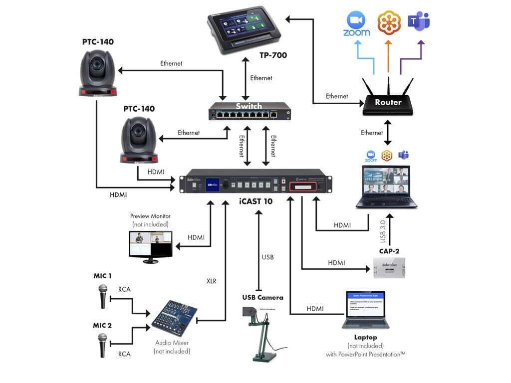 Ein hybrider Event-Umschalter, der für Klassenzimmer, Aufzeichnung von Vorlesungen und Konferenzen mit allen I/Os entwickelt wurde, die zum Produzieren, Streamen, Aufzeichnen und Konferenzen mit Zoom, MS Teams und anderen Plattformen erforderlich sind. Eine intuitive Touchscreen-Oberfläche mit Voreinstellungen für Bildschirmlayouteinstellungen, Kamerawinkel und Schaltflächen zum Aktivieren des Streams und Aufzeichnens Ihres Events.