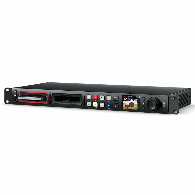 Der eine Rackbreite messende HyperDeck Studio HD Pro von Blackmagic Design bietet alle Features des Plus-Modells und mehr, weil er Platz für extra Features hat. Das größere Modell hat zusätzlich zu den zwei SD-Kartenslots der kleineren Modelle zwei SSD-Slots. So lassen sich Ihre Datenträger unmittelbar für verschiedene HyperDeck Studio Modelle einsetzen. Sie verfügen über schicke Transporttasten und einen metallenen Suchlaufregler mit elektronischer Kupplung, die im Shuttle-Modus die Drehbewegung verlangsamt. Über dedizierte Tasten bestimmen Sie die Jog-, Shuttle- und Scroll-Modi des Suchlaufreglers. Der extra Platz auf der Rückseite wurde für ein Upgrade der Timecode-Anschlüsse zu XLR-Verbindern genutzt.