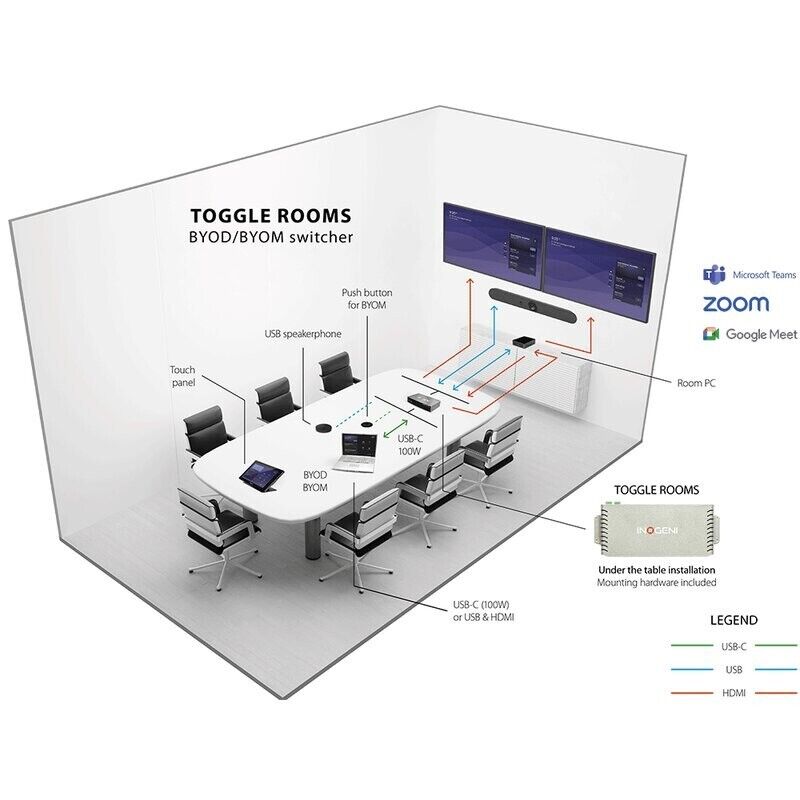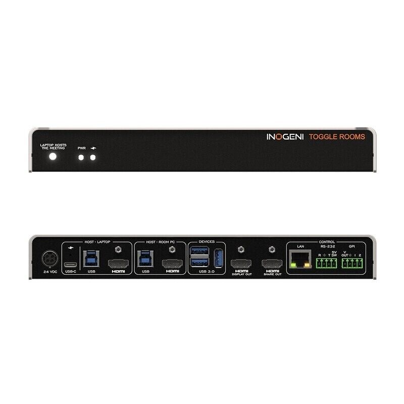 Mit Toggle Rooms hat Inogeni eine ideale USB 3.0-Umschalt-Lösung für Videokonferenzen zwischen einem Raum-PC und einem Laptop entwickelt. Der kleine USB-Mischer kann mit drei USB-3.0-Geräten und einem HDMI-Display verbunden werden.