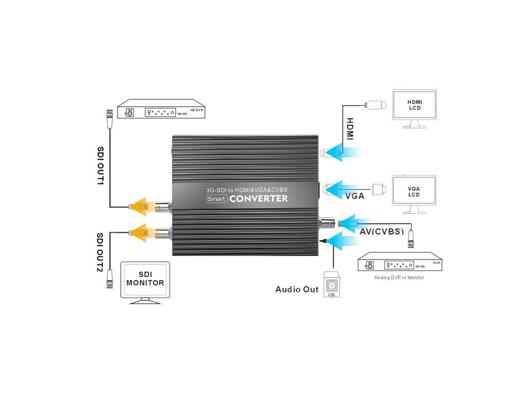 • SD / HD / 3G SDI zu HDMI / VGA / AV (CVBS)