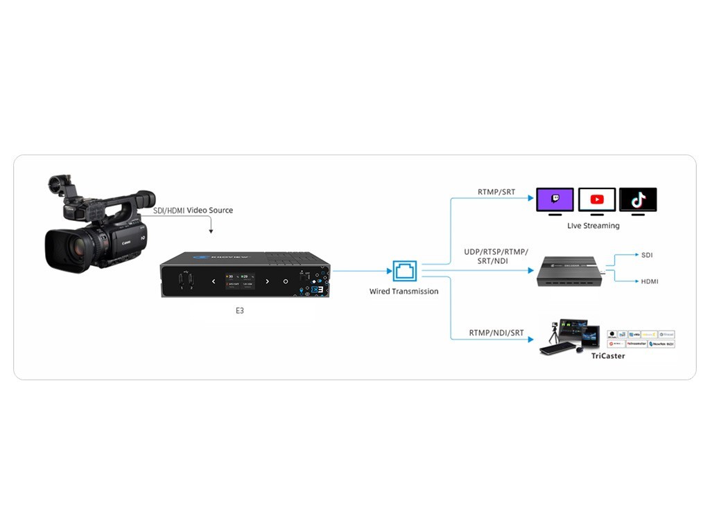 Der E3 kann über seinen HDMI-Anschluss ein Eingangssignal mit bis zu 4Kp30 und über seinen 3G-SDI-Anschluss einspeisen. Dank seiner leistungsstarken Ausgabemöglichkeiten kann der E3 gleichzeitig auf bis zu 16 verschiedenen Plattformen live übertragen, indem er sowohl im Hauptsignal (bis zu 8 Kanäle in 1080p) als auch im Substream (bis zu 8 Kanäle in 720p) mit einstellbarer Bitrate ausgibt; die maximale Bitrate beträgt bis zu 100 Mbit/s.