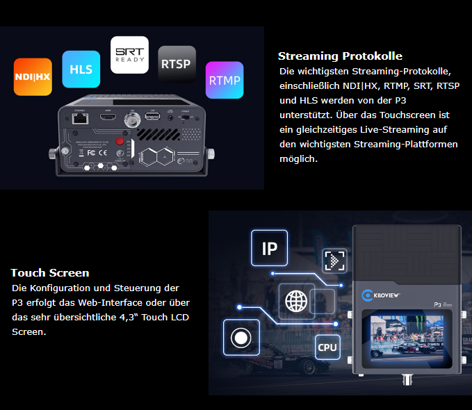 P3 unterstützt eine Vielzahl von Streaming-Protokollen, einschließlich NDI | HX, RTMP, SRT, RTSP, HLS.