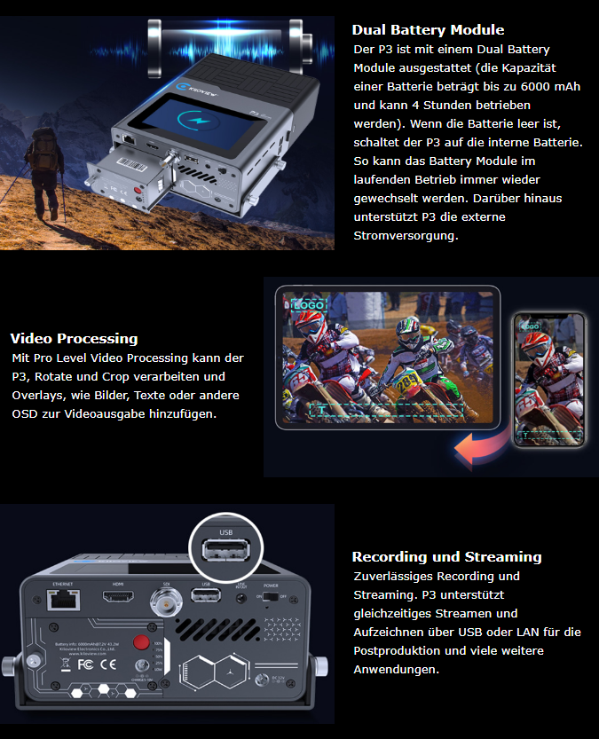 Kiloview P3 ist ein 5G-Bonding-Videoencoder der neuen Generation auf Basis von KiloLink, der Multi-Verbindungs-Bonding unterstützt: 4-Kanal-5G-Mobilfunknetz, WIFI und Ethernet. P3 ist mit zwei Videoeingängen von 3G-SDI und HDMI mit einer Auflösung von bis zu 4Kp30 über seinen HDMI-Eingang und bis zu 1080p60 über seinen SDI-Eingang ausgestattet.