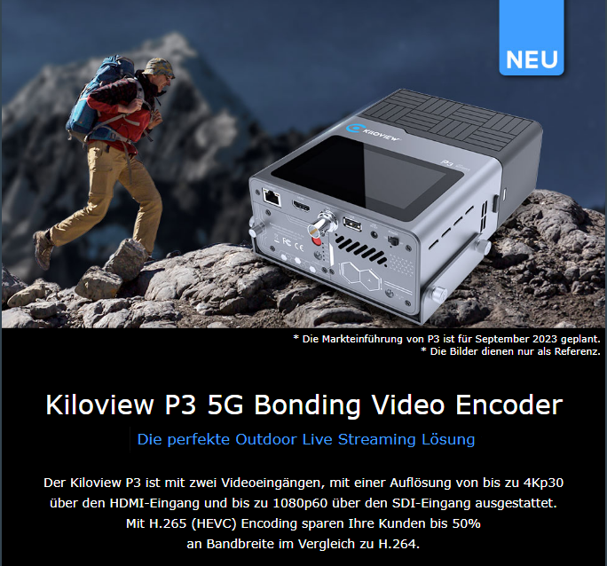 P3 unterstützt die Kodierung H.265 und H.264. Mit der H.265-Kodierung (HEVC) kann eine niedrigere Kodierungsrate erreicht werden, wodurch im Vergleich zu H.264 unter denselben Bedingungen über 50 % Bandbreite eingespart werden. Es unterstützt außerdem einen HDMI-Eingang mit bis zu 4Kp30Hz und einen 3G-SDI-Eingang mit bis zu 1080p60.