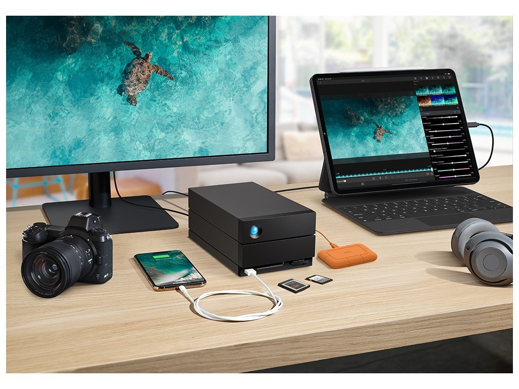Das LaCie® 2big Dock ist ideal für PC, iPad (USB-C) und Mac – ein Desktop-RAID-System mit enormer Speicherkapazität und Geschwindigkeiten von bis zu 550 MB/s. Die beiden Thunderbolt-Anschlüsse sind mit USB4, USB 3.2, USB 3.0 und Thunderbolt 4 kompatibel und eignen sich für die Reihenschaltung von bis zu fünf Thunderbolt-Geräten. Außerdem verfügt die Lösung über Hot-Swap-fähige IronWolf Pro-Festplatten der Enterprise-Klasse für langfristig hohe Leistung.