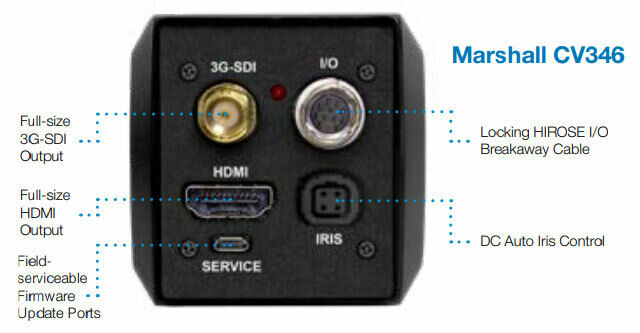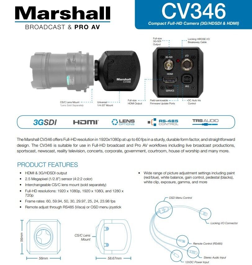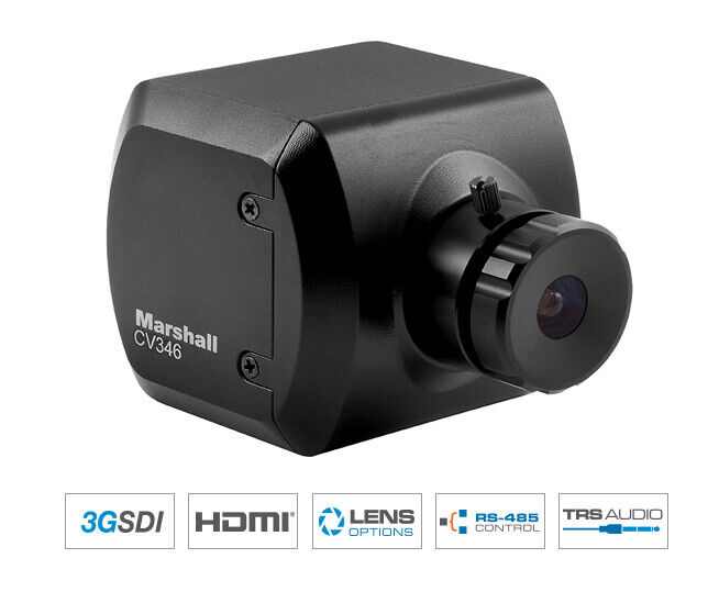 Die Marshall CV346 ist eine Full-HD-Kompakt-Kamera, die sich ideal als POV-Kamera oder für den Einsatz an schwer zugänglichen Stellen eignet, um eine besondere Perspektive zu bieten. Mit Ihren SDI- und HDMI-Ausgängen sowie verschraubbarem Hirose-I/O-Anschluss eignet sie sich ideal für den Einsatz im professionellen Bereich als Ergänzung zu bestehenden Studio-Kameras.