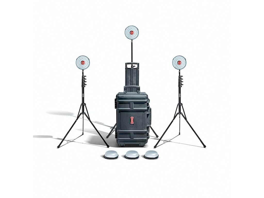 3 x NEO 3, 3 Diffusorkuppeln, 3 Batterien, 3 Lichtstative, 1 x Zweikanal-Schnellladegerät und Hartschalenkoffer