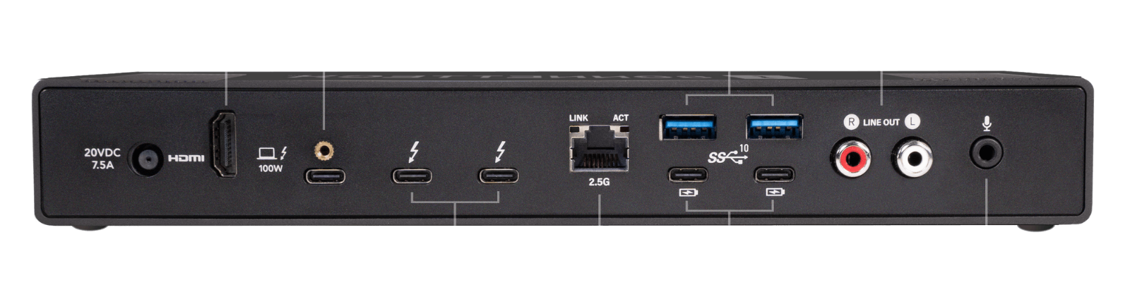 Drei Thunderbolt-, acht USB-3-, vier Audio-I/O-, HDMI- und 2,5-GbE-Ports, ein SD-Kartensteckplatz und bis zu 8 TB interner M.2-SSD-Speicher. Unterstützung für 2 Bildschirme.