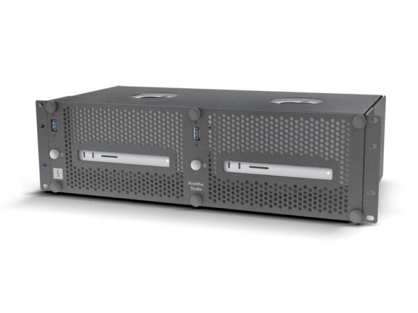 RackMac Studio ist ein robustes 3U-Rackmount-Gehäuse aus Stahl zur Befestigung von einem oder zwei Mac Studio-Computern in einem Rack.