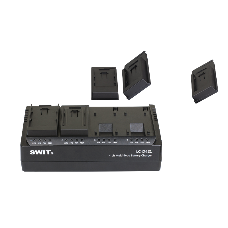 Das Swit LC-D421D Set besteht aus einem LC-D421 Ladegerät und vier VBD Platten KA-C10D. Eine 4-Kanal-Simultanladung ist mit dem LC-D421 möglich. Durch die austauschbaren VBD KA-C10D-Platten ist es möglich das Ladegerät für beliebige U/F/D/B/C/I/V/E-Akkus zu nutzen.