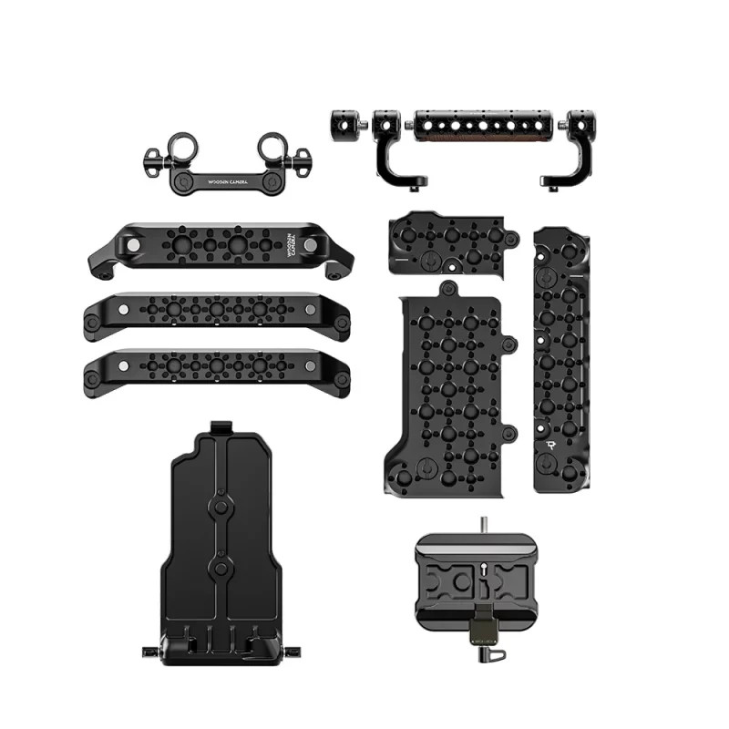 Die modulare 3-Platten-Top-Plate ermöglicht es dem Benutzer, sein Kamera-Rig-Setup mit verschiedenen Befestigungspunkten anzupassen. Bei Verwendung aller 3 Platten wird der Einschubkanal für Zubehör an der Kamera abgedeckt. Die Seitenplatte und die Frontplatte lassen sich jedoch abtrennen, so dass die Einschubfunktion bei Bedarf für die Verwendung des nativen Griffs freigelegt werden kann. Blindlöcher schützen die Kamera vor Beschädigungen. Die mitgelieferten Seitenschienen bieten strategisch erweiterte Befestigungsmöglichkeiten für Zubehör.