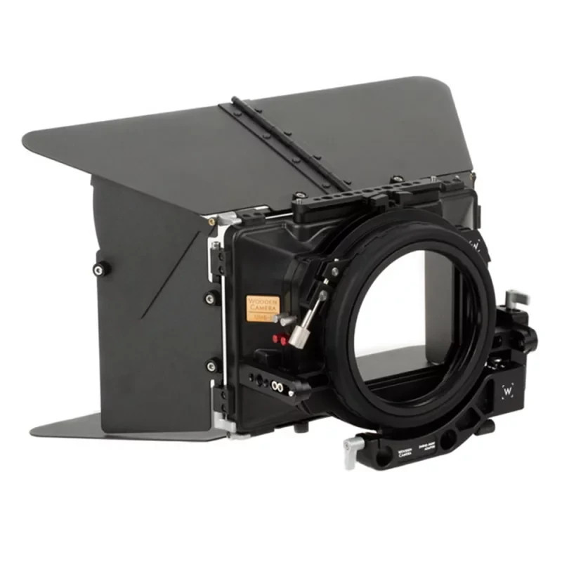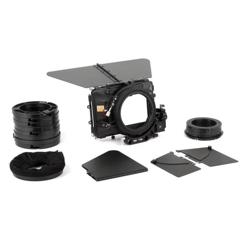 Die UMB-1 Universal Mattebox (Pro) von Wooden Camera basiert nativ auf 15mm-LW-Stangen und kommt serienmäßig mit zwei rotierenden 4×5,65-Filterstufen (optionale dritte Stufe verfügbar), individuellen Trayhaltern, faltbarer Frenchflag, 143mm nativer Durchmesser Öffnung, NATO-Standardzubehörschienen links, rechts und oben zum Anbringen von Zubehör, Gummibälgen im ARRI-Stil mit 114mm Standardöffnung, einem kompletten Satz Balg-Reduzierringe, einem Universal Stoffdonut für nicht standardmäßige Linsendurchmesser, einer höhenverstellbaren Wegschwenkklammer, Blenden für die linke und rechte Seite, einer Blende für die Unterseite, sowie einem vollständigen Satz Festklemm-Adapterringe. Die UMB-1 ist so konzipiert, dass sie bei Verwendung eines Stabilisators schnell von der Variante zum Wegschwenken zur Festklemm- und Ultraleichtvariante gewechselt werden kann.
